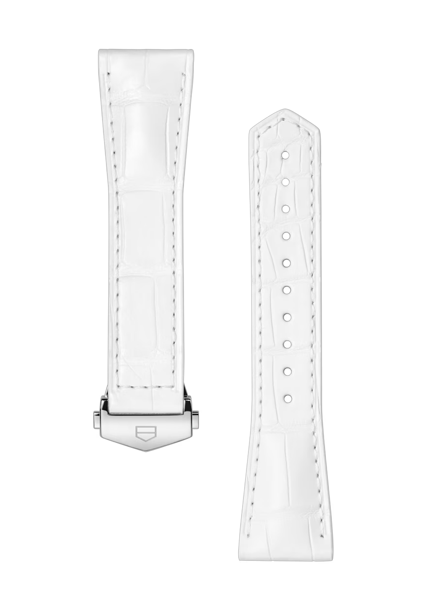 A bold statement in clean-cut white alligator leather, this interchangeable TAG Heuer Carrera strap, adapted to selected 39mm models, embodies pure elegance. Its smooth, mat surface, enhanced by tone-on-tone stitching and a beige lining, presents a refined aesthetic. The polished deployant steel pin buckle ensures both style and durability on the wrist.